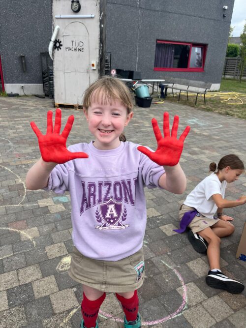 Vandaag begon meteen stevig: we startten de voormiddag met verftwister! Het was een kleurrijk begin waarbij iedereen al snel onder de verf zat. Maar dat was nog maar het begin, want daarna werd het alleen maar vettiger. Van glibberige parcours tot zeepige uitdagingen, niemand bleef proper, en dat was juist de bedoeling!
